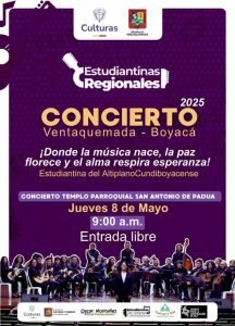 Sumérgete en la riqueza sonora de nuestra región con un espectáculo musical inolvidable. Este jueves 8 de mayo de 2025, acompáñanos en el Templo Parroquial San Antonio de Padua en Ventaquemada, Boyacá, desde las 9:00 a.m., y déjate envolver por las melodías tradicionales que celebran el alma del altiplano cundiboyacense.