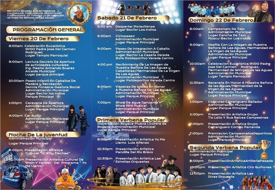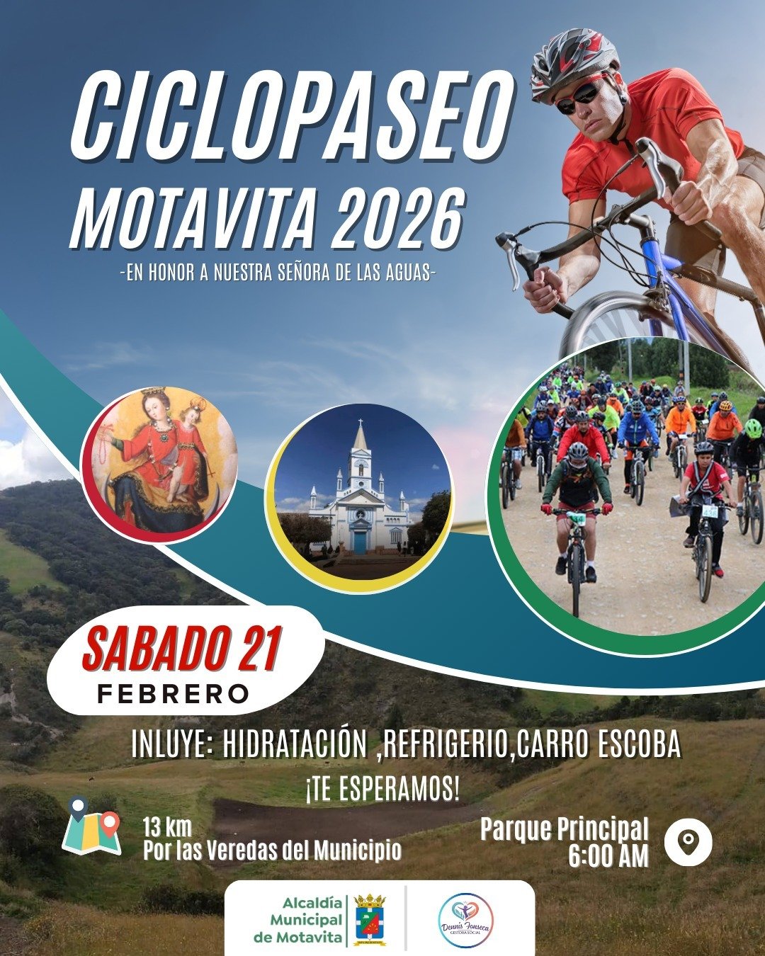 La Alcaldía Municipal de Motavita invita con orgullo a toda la comunidad motavitense y a los visitantes de la región y del departamento de Boyacá a participar en el Festival Cultural Motavita 2026 – En Honor a Nuestra Señora de las Aguas, una celebración que resalta nuestras tradiciones, fortalece la identidad cultural y rinde homenaje a la fe que une a nuestro pueblo.