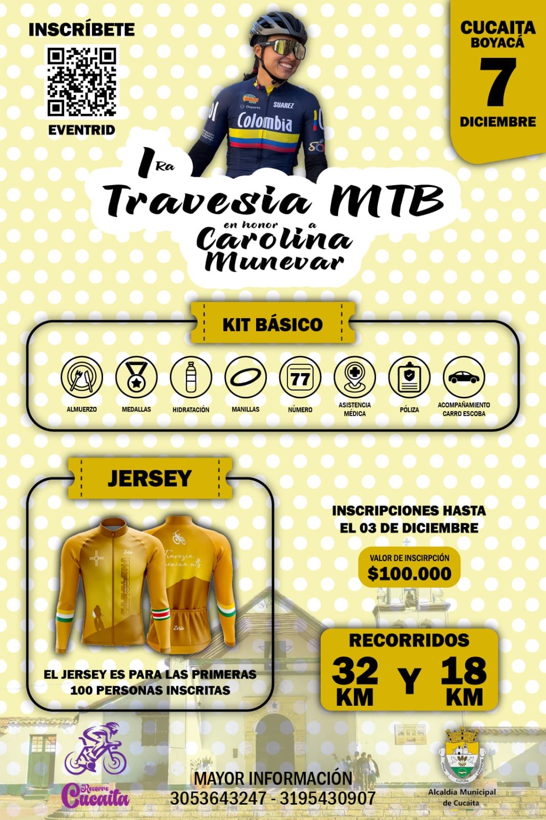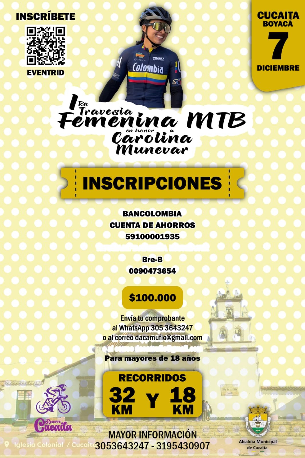 La 1Ra Travesía Femenina MTB en Honor a Carolina Munévar es un evento deportivo que celebra la fuerza, valentía y determinación de las mujeres ciclistas. Inspirada en la trayectoria ejemplar de Carolina Munévar, referente del paraciclismo colombiano y símbolo de perseverancia, esta travesía invita a mujeres de todas las edades y niveles a recorrer rutas de montaña llenas de naturaleza, desafío y compañerismo.