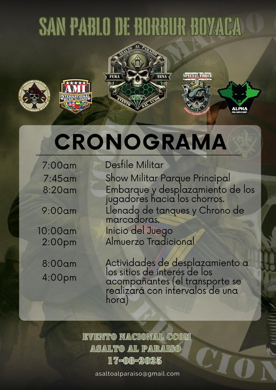 Este 17 de agosto de 2025, prepárate para el Evento Nacional “Asalto al Paraíso”, una jornada que combina historia, destreza y espectáculo. Vive la emoción de un impactante desfile militar, un show lleno de acción y precisión y muchas sorpresas más que te harán sentir el orgullo de nuestra nación.