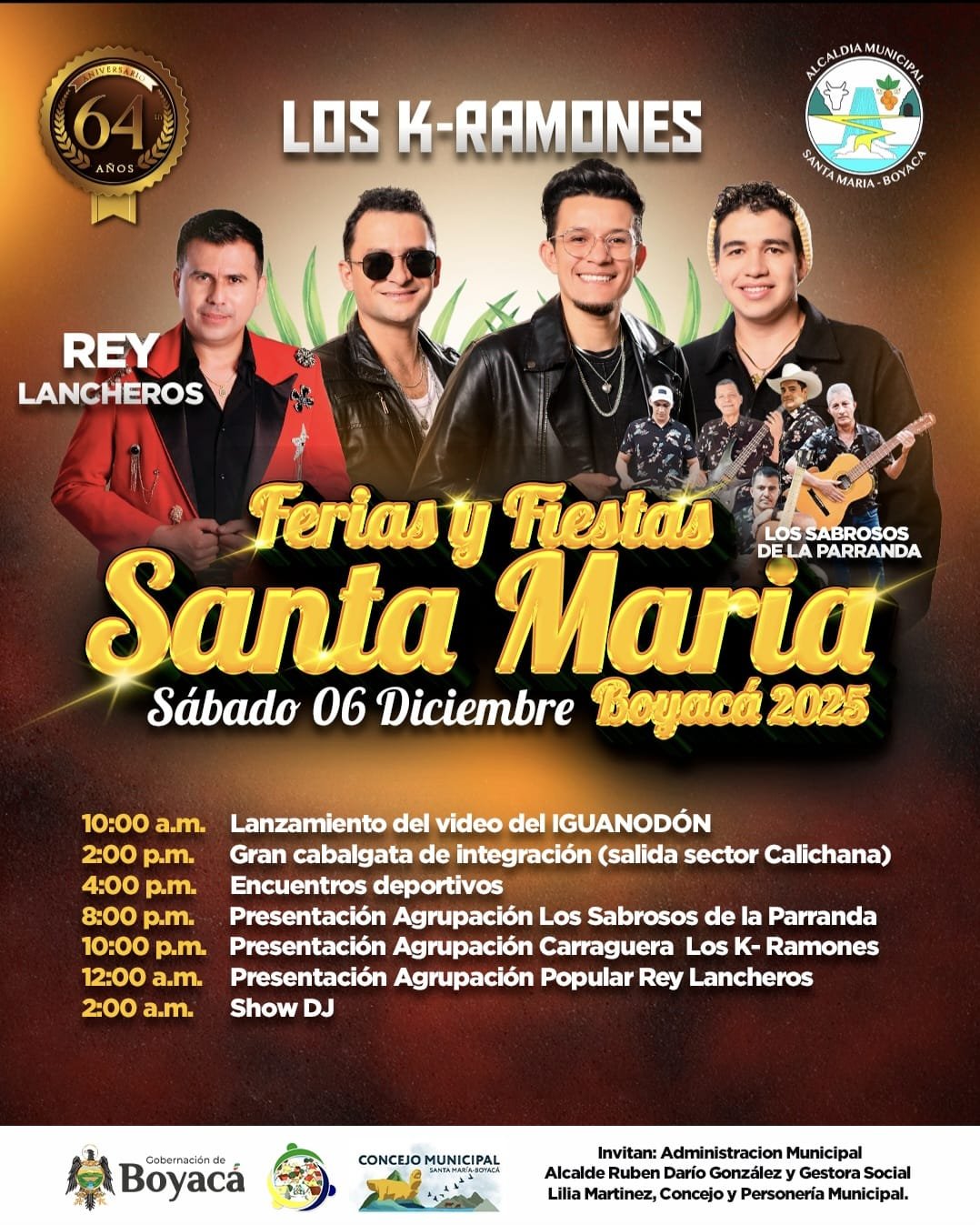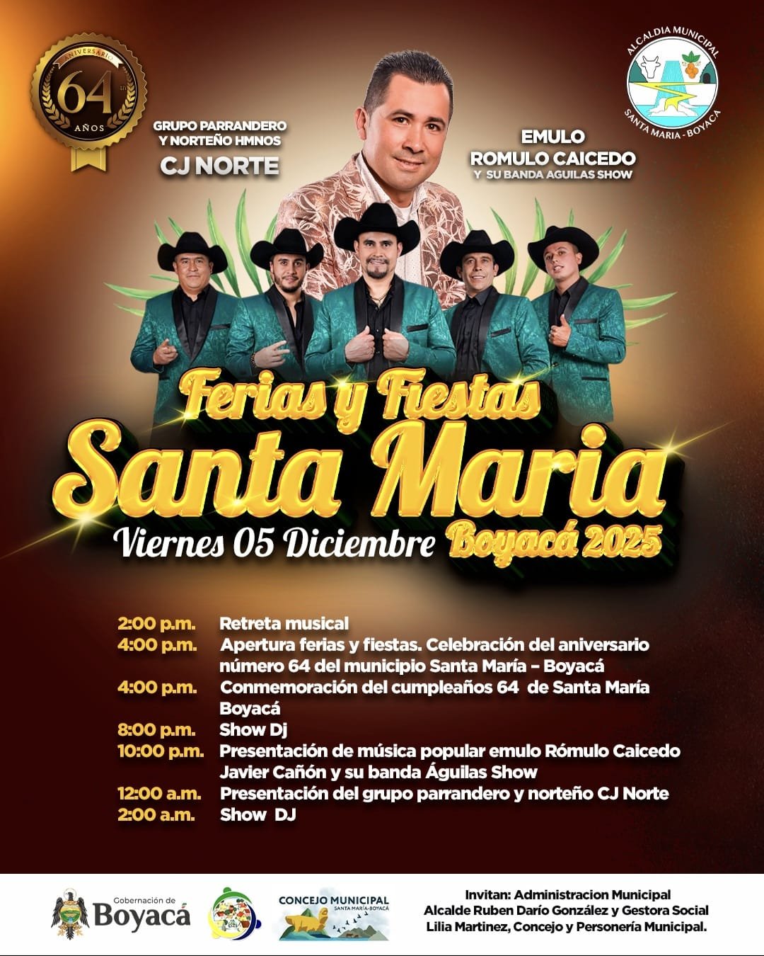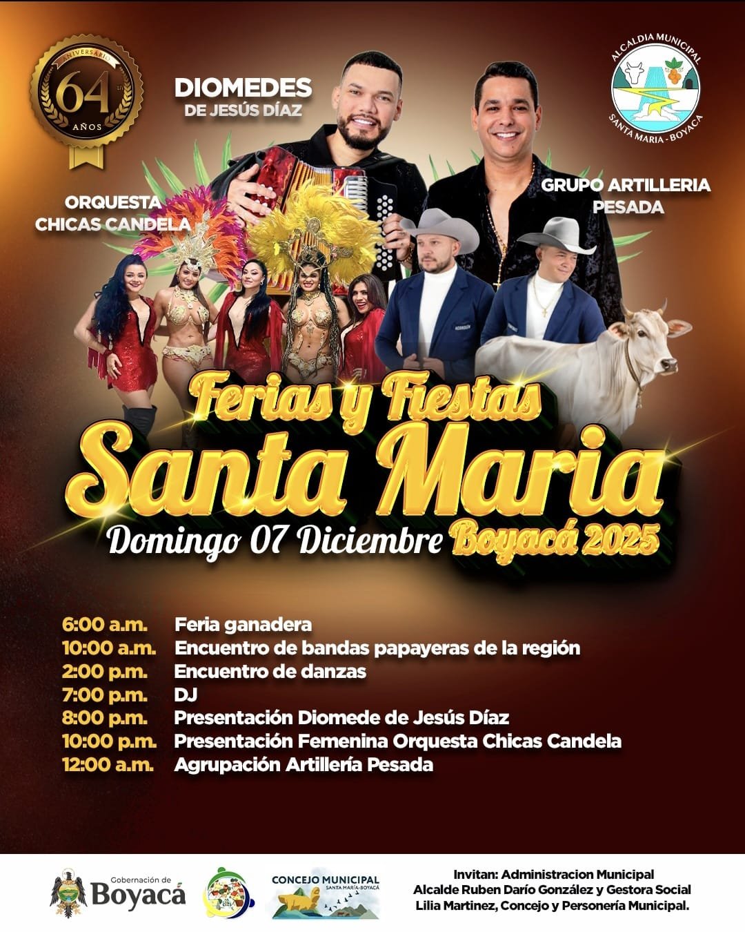 La Administración Municipal de Santa María, en cabeza del señor alcalde Rubén Darío González, invita a toda la comunidad santamariense y a nuestros municipios vecinos a disfrutar este sábado 6 de diciembre de una noche que promete prender la fiesta como se debe.