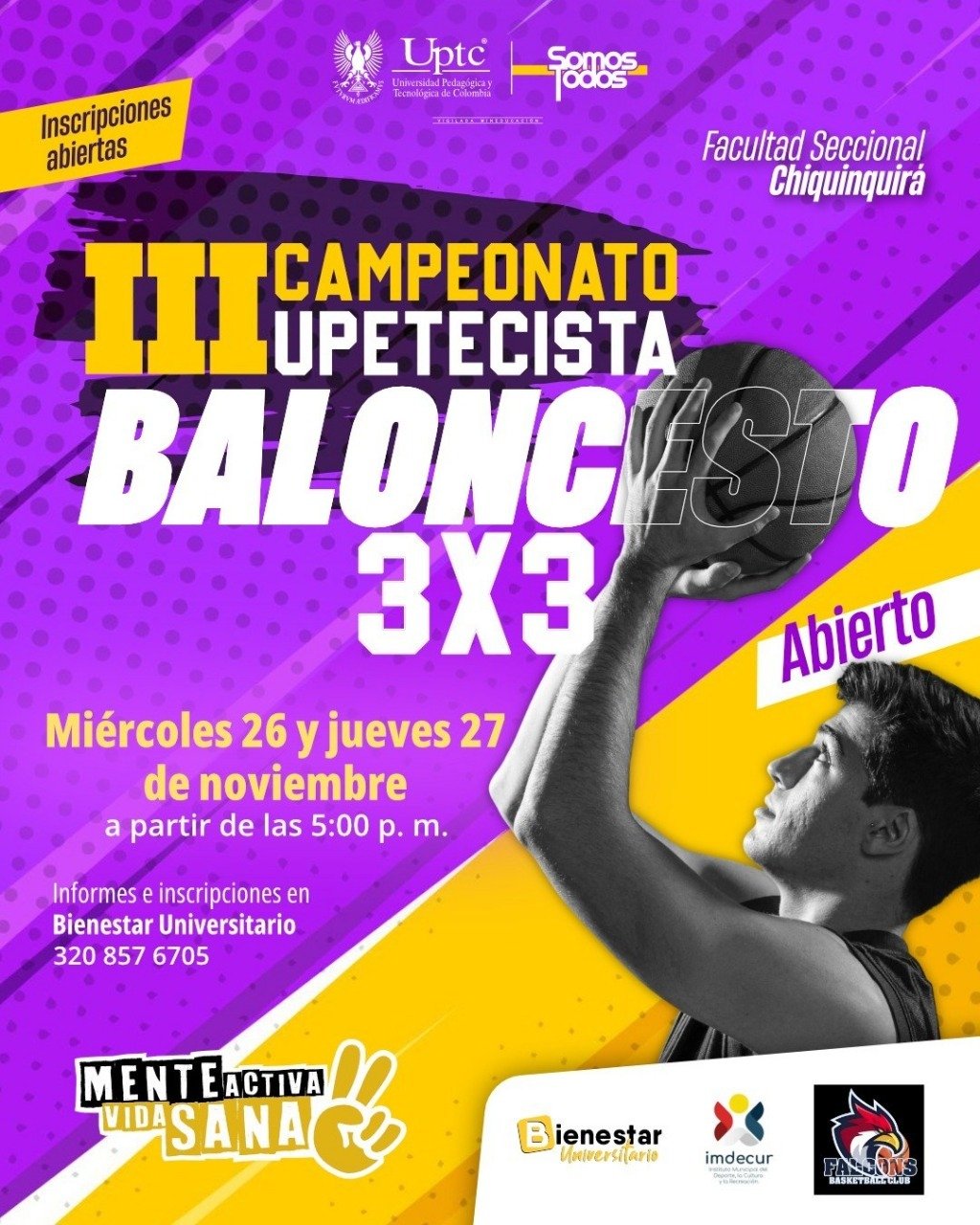 La alcaldía de Chiquinquirá, el Imdecur, la UPTC y el club Falcons invitan a todos los basquetbolistas de ambas ramas a hacer parte de este espectacular torneo. La inscripción tiene un costo de cuarenta mil pesos e incluye el juzgamiento.