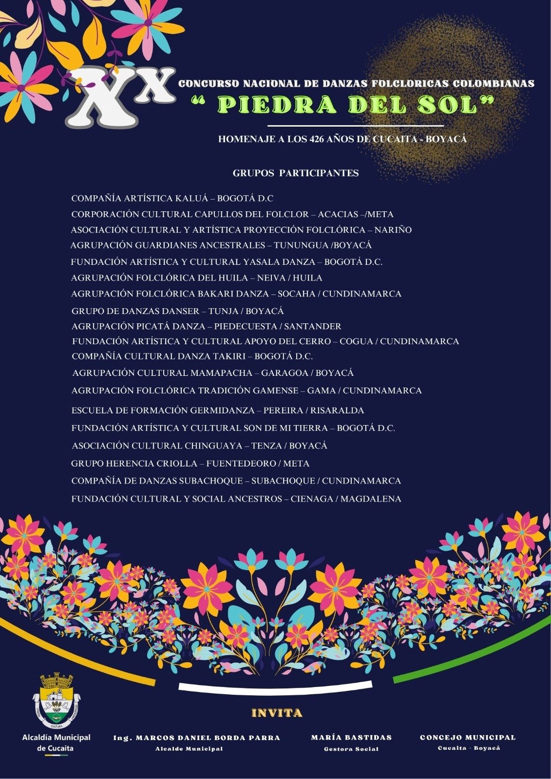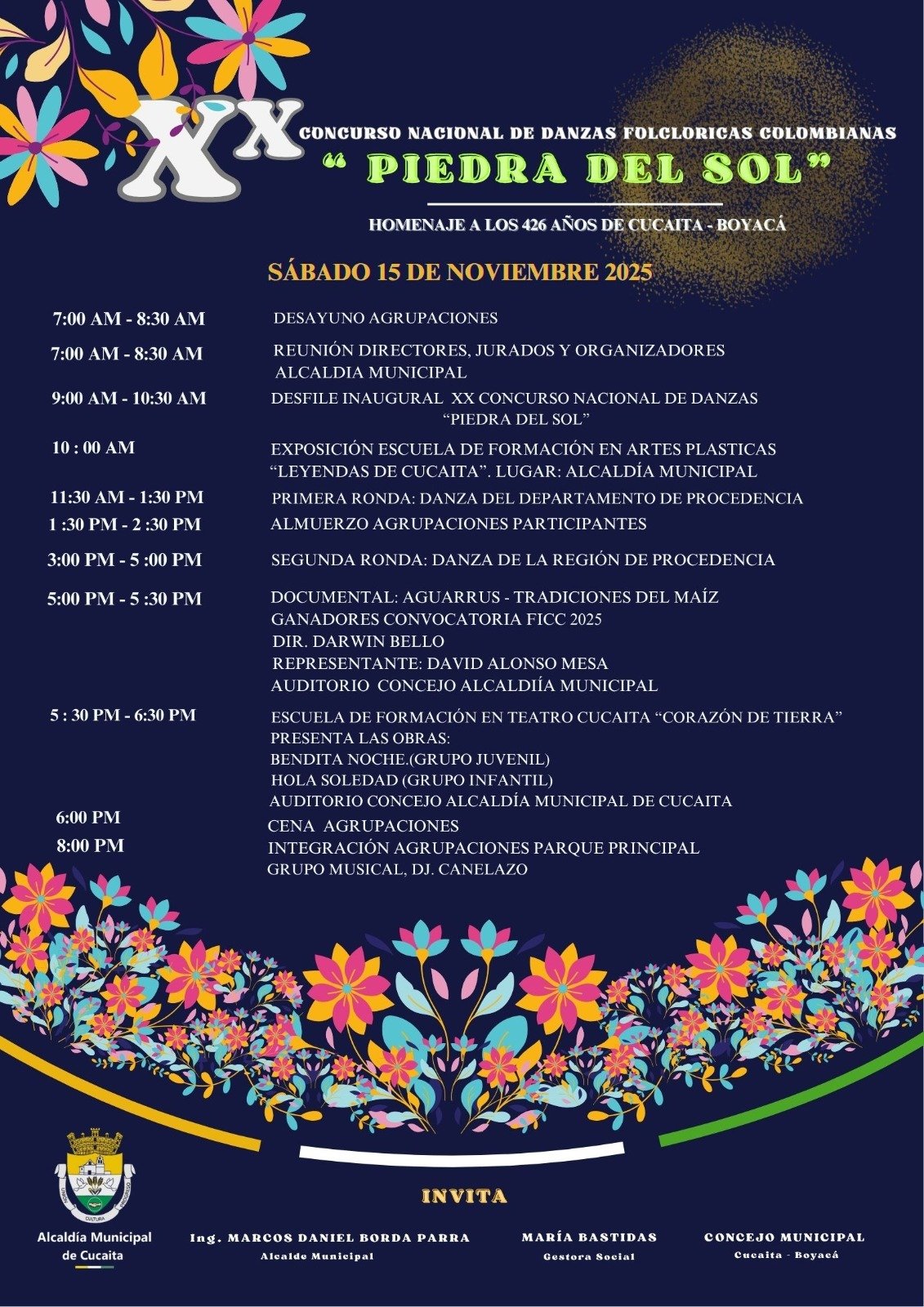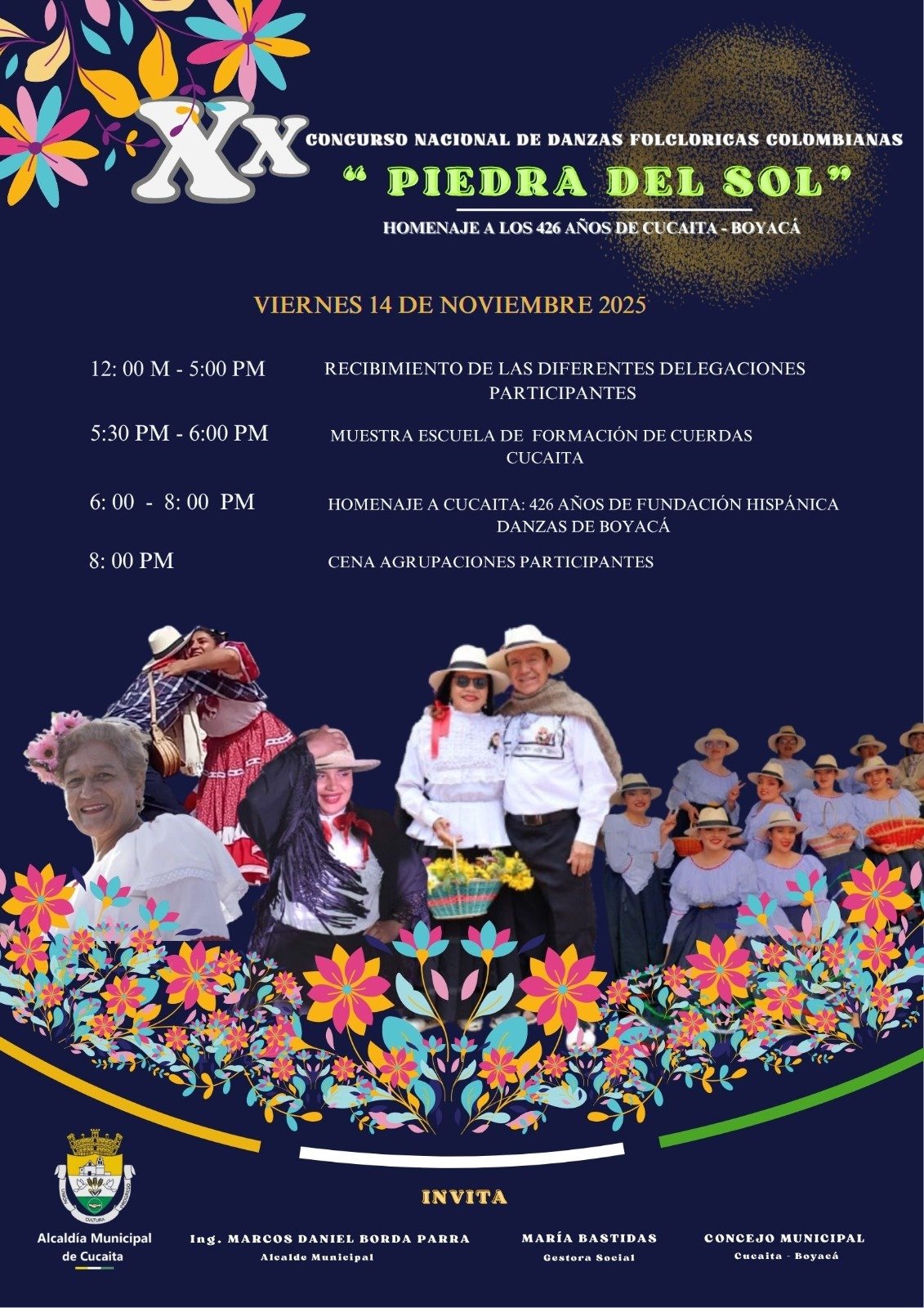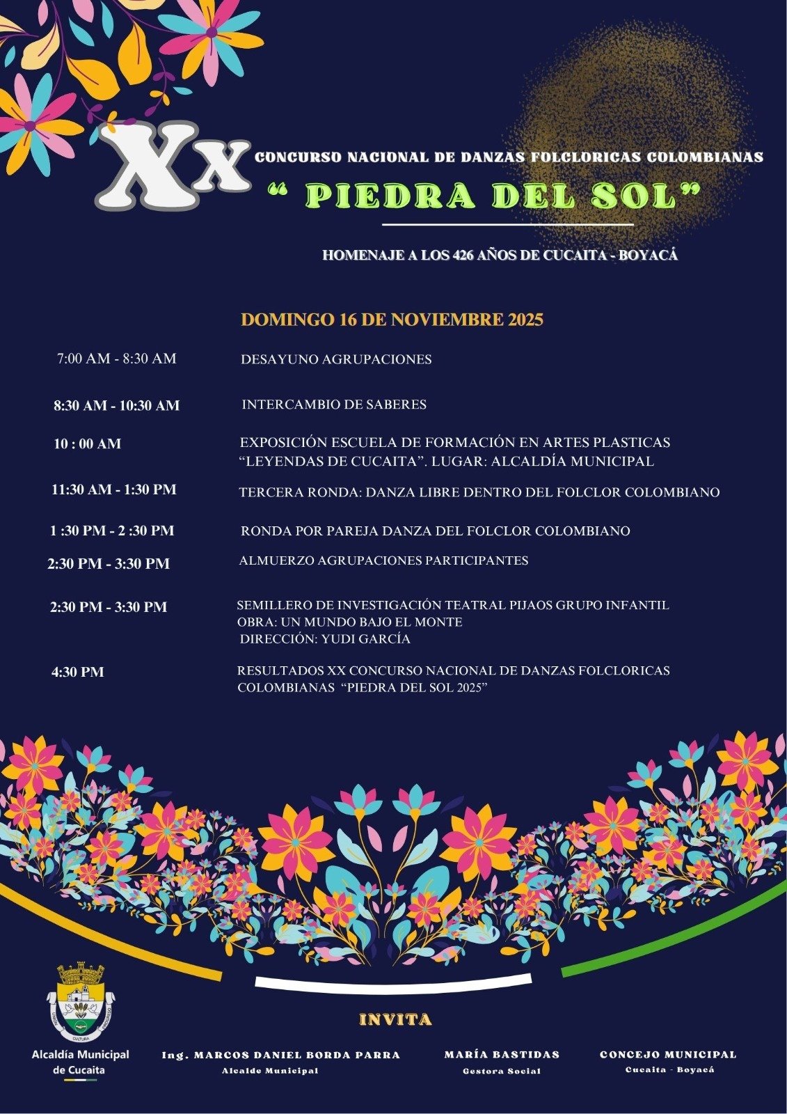 Tenemos lista la programación del XX Concurso Nacional de Danzas Folclóricas Colombianas “Piedra del Sol”, en conmemoración de los 426 años de fundación hispánica de nuestro querido municipio.